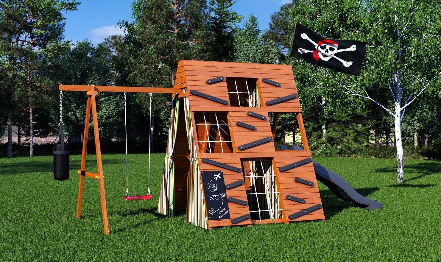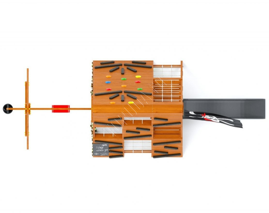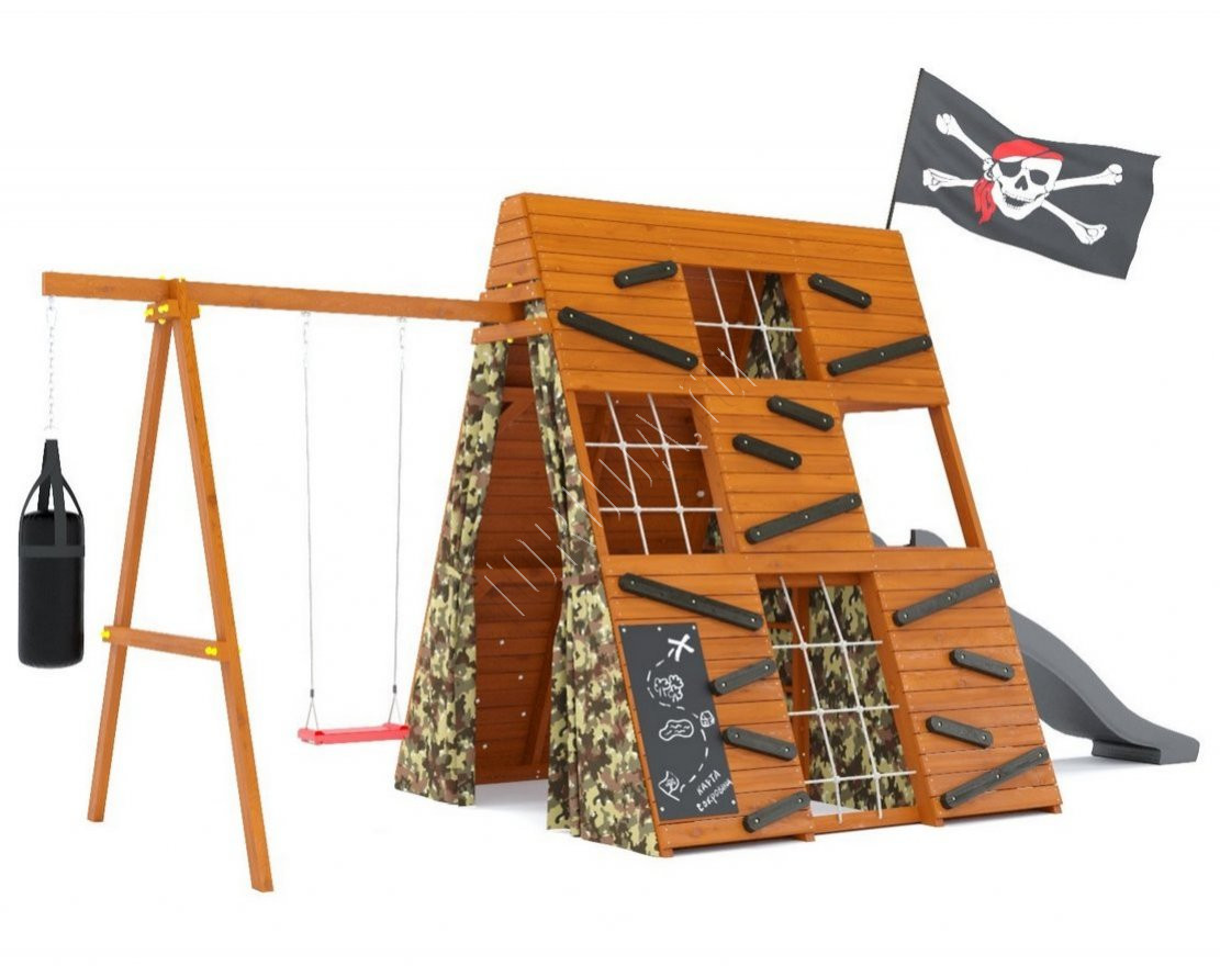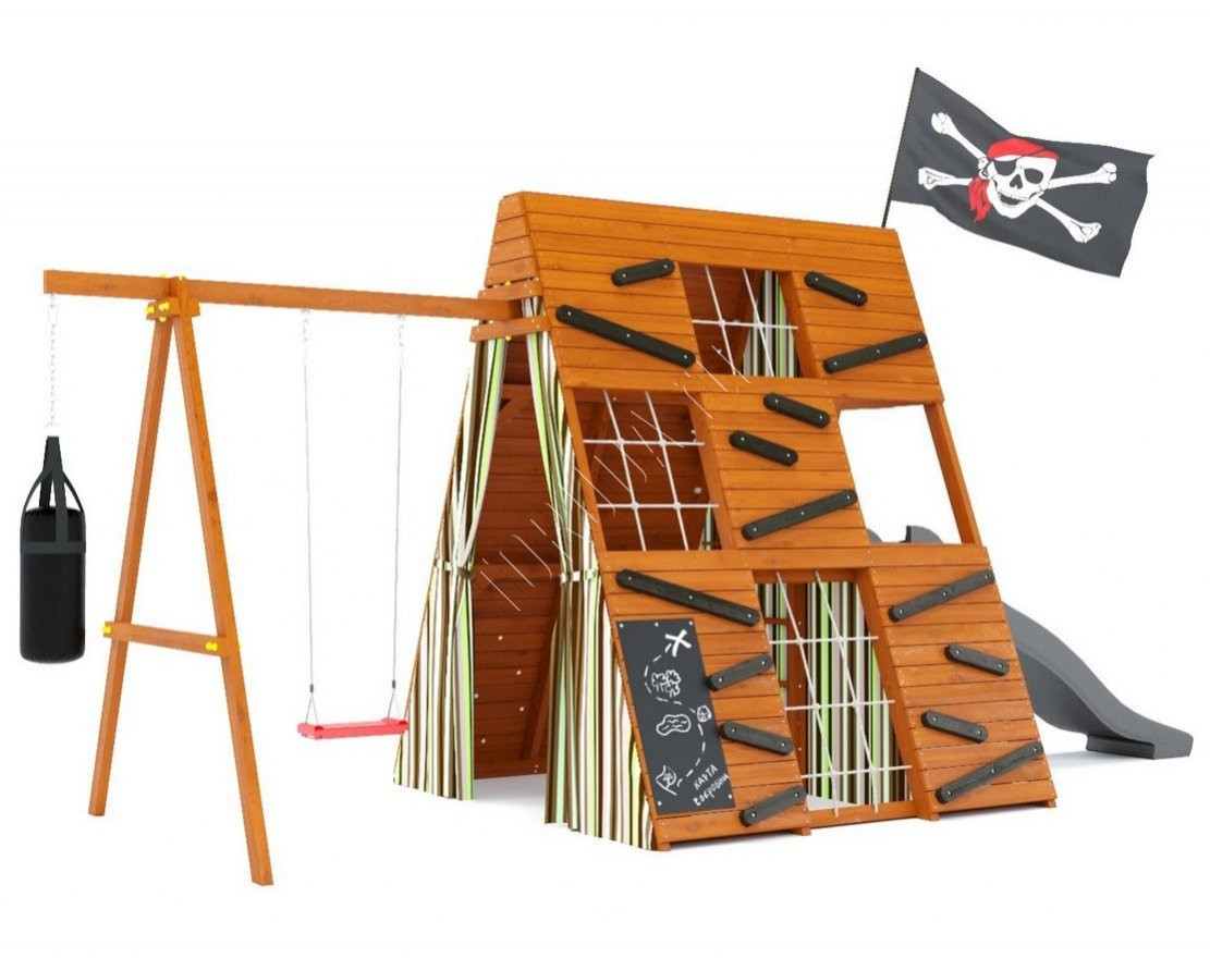 - Занавесы с подхватами способствуют созданию мелодраматических сцен, а наличие меловой доски размером 810х390 мм позволит детям рассказывать свои истории и рисовать картинки. Внутренняя лестница и большой пиратский флаг с флагштоком создадут атмосферу пиратства и игр в прятки.