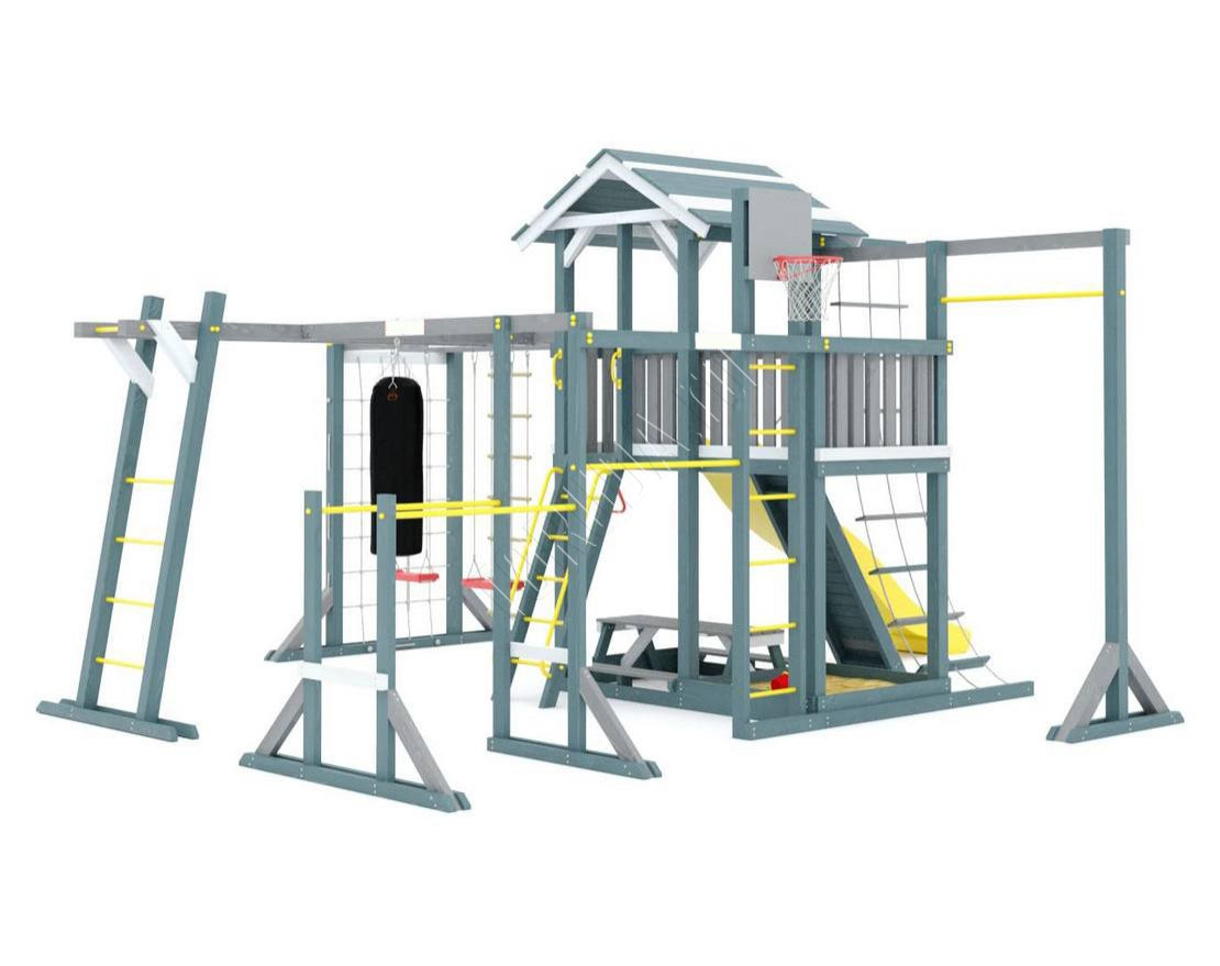 - Ребят постарше заинтересуют: шведская стенка, горизонтальная лестница (рукоход), детские гимнастические кольца, а также металлические параллельные брусья. Для развития мышц рук в модели предусмотрены два турника - детский и взрослый.