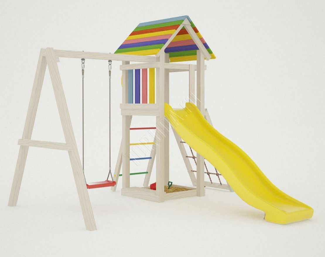 - Домик закрыт сверху деревянным перекрытием – оно скрывает от прямых солнечных лучей и позволяет передохнуть на свежем воздухе. Комплекс универсален, поскольку включает в себя столь любимые детьми горку и качели.
