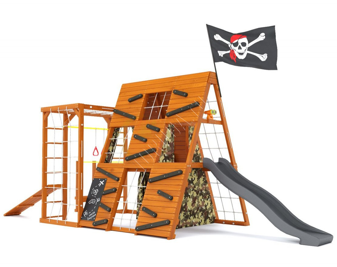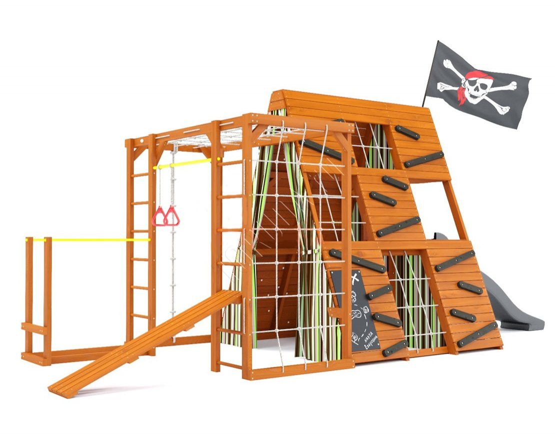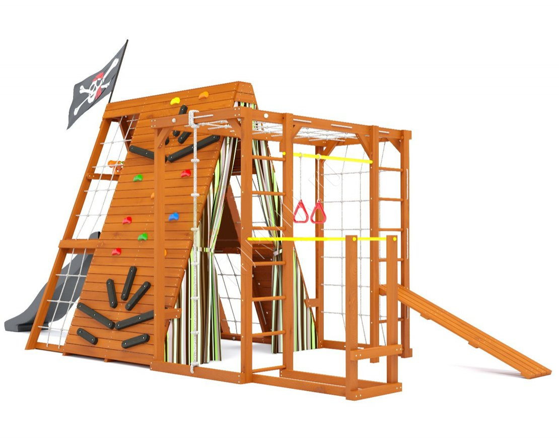 Тематический домик широкого назначения со спортивно-игровыми функциями, внутренняя игровая площадь которого составляет 3,6 кв. метра, а комплект распашных занавесов с подхватами придаст вашему домику уютный и защищённый вид.