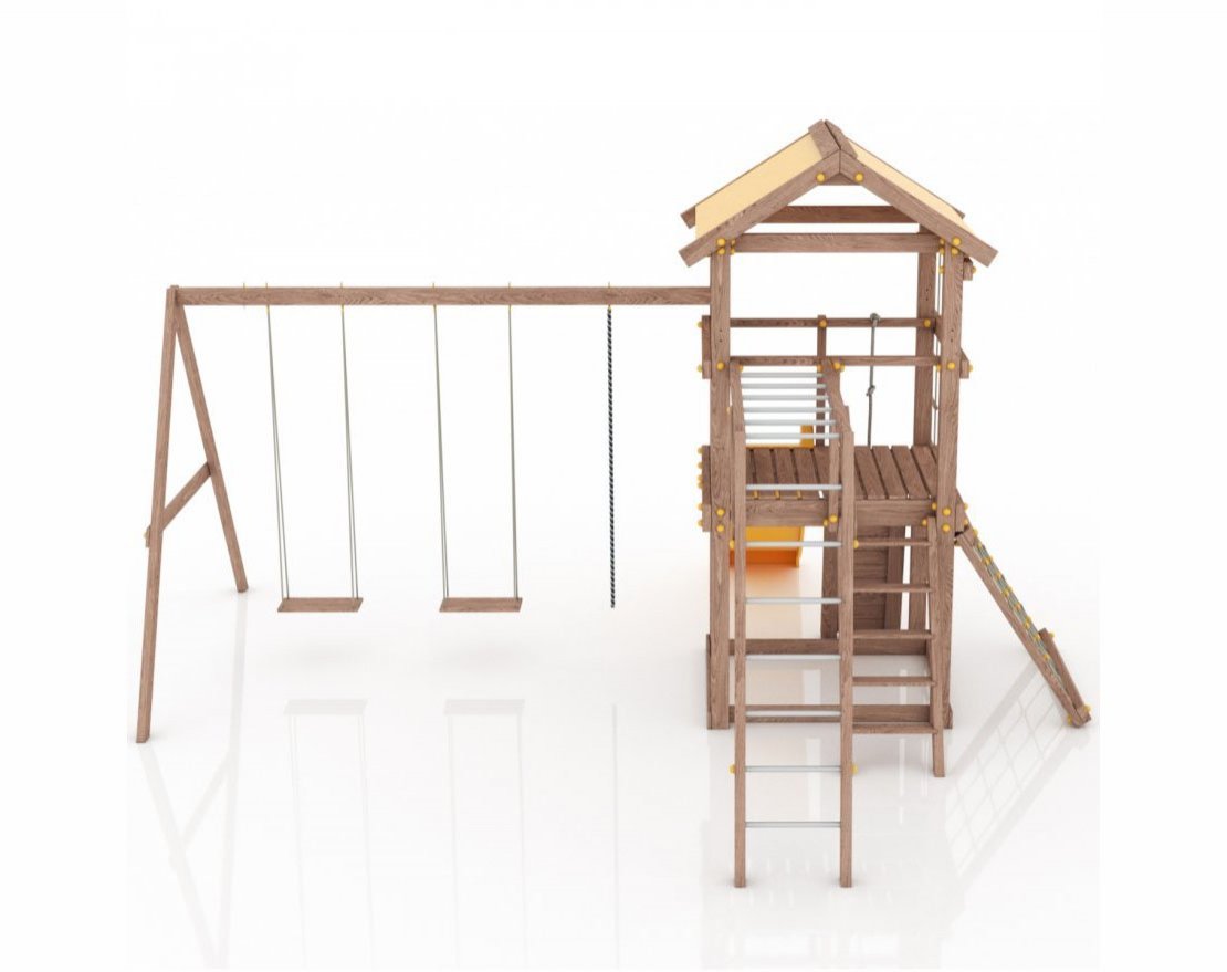 Детская площадка изготовлена в соответствии с ГОСТ Р 52168-2012. Опоры и несущие элементы изделия изготовлены из клееного бруса карельской сосны 90х90 мм, доска 40х90мм, 40х140мм, другие перекрытия 20х90мм доска, ограждение и иные элементы из массива сосны. Везде используется сухая доска.
